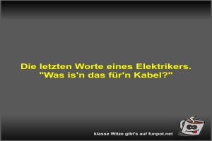 | Die letzten Worte eines Elektrikers Bild (17.75 KB) 1Lustiges → klasse Sprüche und Witze | Lustiges → klasse Sprüche und Witze | 14.11.-18:41 | Fossy | |
