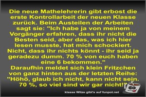 | Die neue Mathelehrerin gibt erbost die erste Kontrollarbeit Bild (74.68 KB) Lustiges → klasse Sprüche und Witze | Lustiges → klasse Sprüche und Witze | 05.02.-18:28 | Fossy | ||