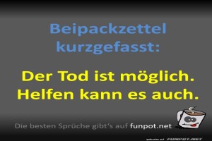 | Beipackzettel kurzgefasst Bild (59.53 KB) 6Lustiges → klasse Sprüche und Witze So könnte man den ellenlangen Beipackzettel mit wenigen Worten zusammenfassen ;-) | Lustiges → klasse Sprüche und Witze | 27.01.-09:13 | ||