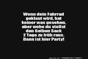 | Fahrrad geklaut, niemand hat was gesehen Bild (39.97 KB) 7Lustiges → klasse Sprüche und Witze | Lustiges → klasse Sprüche und Witze | 25.01.-11:41 | ||