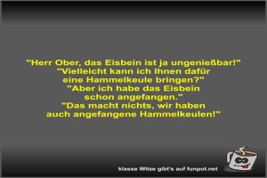 | "Herr Ober, das Eisbein ist ja ungenießbar!" Bild (31.29 KB) 1Lustiges → klasse Sprüche und Witze | Lustiges → klasse Sprüche und Witze | 21.10.-17:52 | Fossy | |