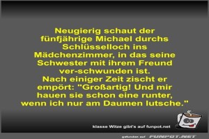 | Neugierig schaut der fünfjährige Michael durchs... Bild (45.51 KB) 4Lustiges → klasse Sprüche und Witze | Lustiges → klasse Sprüche und Witze | 09.08.24-12:23 | Fossy | |