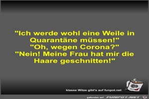 | "Ich werde wohl eine Weile in Quarantäne müssen!" Bild (30.92 KB) 10Lustiges → klasse Sprüche und Witze und Corona | Lustiges → klasse Sprüche und Witze und Corona | 08.07.21-11:16 | Fossy | |