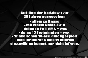 | Lockdown vor 20 Jahren Bild (78.53 KB) 8Lustiges → klasse Sprüche und Witze und Corona | Lustiges → klasse Sprüche und Witze und Corona | 29.04.21-16:43 | Noah75 | |