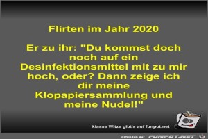 | Flirten im Jahr 2020 Bild (37.19 KB) 4Lustiges → klasse Sprüche und Witze und Corona | Lustiges → klasse Sprüche und Witze und Corona | 01.05.21-17:51 | Fossy | |