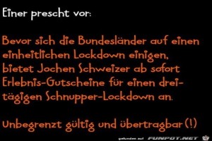 |  2 |       | Jochen Schweizer Gutschein für Schnupper-Lockdown Bild (51.46 KB)  2 Lustiges → klasse Sprüche und Witze und Corona | Lustiges → klasse Sprüche und Witze und Corona | 11.04.21-08:43 | Noah75 | |