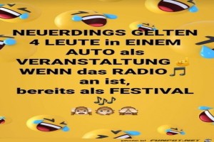 | 4 Leute im Auto gelten als Festival Bild (87.79 KB)  7Lustiges → klasse Sprüche und Witze und Corona  | Lustiges → klasse Sprüche und Witze und Corona | 18.03.21-10:27 | Hannah | |