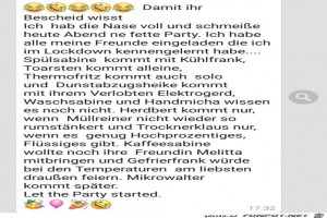 | Das wird eine tolle Party Bild (124.04 KB) 13Lustiges → klasse Sprüche und Witze und Corona | Lustiges → klasse Sprüche und Witze und Corona | 26.01.21-17:35 | babs | |