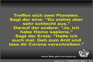 | Treffen sich zwei Planeten Bild (43.32 KB) 6Lustiges → klasse Sprüche und Witze und Corona | Lustiges → klasse Sprüche und Witze und Corona | 27.01.21-14:58 | Fossy | |