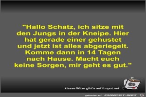 | Hallo Schatz, ich sitze mit den Jungs in der Kneipe Bild (40.39 KB) 8Lustiges → klasse Sprüche und Witze und Corona | Lustiges → klasse Sprüche und Witze und Corona | 27.01.21-08:06 | Fossy | |
