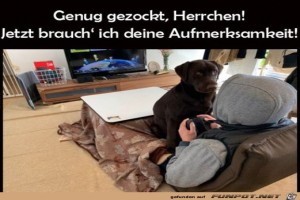 | Genug gezockt Bild (81.53 KB) 18Lustiges → witzige Bilder und lustige Hunde | Lustiges → witzige Bilder und lustige Hunde | 20.02.23-07:26 | ||