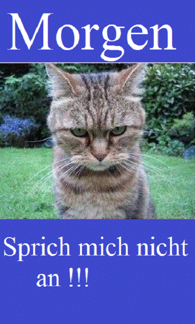 | Montag Bild (272.96 KB) 8Lustiges → witzige Bilder → animierte Bilder und lustige Katzen Sprich mich nicht an!!! | Lustiges → witzige Bilder → animierte Bilder und lustige Katzen | 16.02.24-23:16 | Artist | |