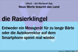 | 0617-Neue-Worte-Rasierkli ngel Bild (66.97 KB) 1Lustiges → neue Wörter braucht das Land die Rasierklingel: Entweder ein Messgerät für zu lange Bärte oder die Autokorrektur auf dem Smartphone spinnt mal wieder. | Lustiges → neue Wörter braucht das Land | 23.12.20-20:48 | Luz | |