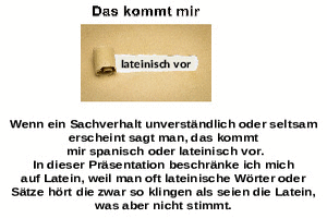 | Das kommt mir lateinisch vor Powerpoint (3.17 MB) 35Lustiges Bei dem Titel dieser herrlichen Präsentation dachte ich im ersten Moment, dass das ein Fehler wäre. Denn ich kenne eigentlich nur den Ausdruck "das kommt mir spanisch vor". Was es mit dem Latein so alles auf sich hat, verrät dir diese amüsante Datei. | Lustiges | 18.01.24-21:51 | lucky | |