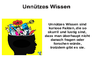 | Unnötiges Wissen Powerpoint (4.88 MB) 40Lustiges → Wissenswertes Kuriose Fakten, die man zwar nicht wissen muss, die aber trotzdem interessant und amüsant sind ;-) Das solltest du dir auf keinen Fall entgehen lassen. | Lustiges → Wissenswertes | 20.01.24-21:36 | lucky | |