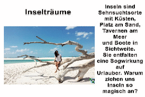 | Inselträume Powerpoint (6.51 MB) 56Lustiges Achtung, hier werden Urlaubsträume geweckt ;-) Es geht nämlich um schöne Inseln und die Bilder machen natürlich sofort Lust auf Urlaub. Witze über Inseln sind natürlich auch enthalten. Also mal wieder eine rundrum gelungene Präsentation! | Lustiges | 06.11.23-21:23 | lucky | |