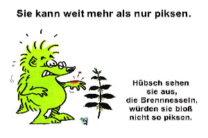 | Sie kann weit mehr als nur piksen Powerpoint (13.36 MB) 47Lustiges → Wissenswertes Brennnesseln können richig fies piksen. Aber nicht nur die Pflanze kann unangenehm sein. Wenn mein Frauchen und ihr Bruder früher etwas frech waren, hat ihr Cousin immer Brennnessel am Arm gemacht :-) Was laut ihrer eigenen Aussage durchaus berechtigt war ;-) In dieser tollen Präsentation kannst so einiges über die Brennnessel lernen. Lass dir das auf keinen Fall entgehen. | Lustiges → Wissenswertes | 25.09.23-22:07 | lucky | |