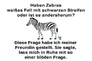 | Haben Zebras weißes Fell mit schwarzen Sreifen oder ist es Powerpoint (8.4 MB) 45Lustiges Hast du dir denn auch schon mal Gedanken darüber gemacht, ob Zebras weißes oder schwarzes Fell haben und die Streifen dann in der jeweils anderen Farbe? Tja, das ist hier die Frage. Ich weiß auf jeden Fall, dass Leggings mit Zebrastreifen fast nur von Leuten getragen werden, die das lieber lassen sollten ;-) | Lustiges | 02.10.23-21:43 | lucky | |