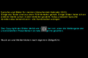| FvK - Kalenderbilder 2023 Powerpoint (8.15 MB) 1Lustiges Kalender mit Bild und Text - nicht zu ernst nehmen - den ich gerne zu Weihnachten verschenke. | Lustiges | 11.12.22-12:34 | FvK | |