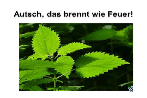 | Autsch, das brennt wie Feuer Powerpoint (6.15 MB) 59Lustiges Wenn man diese tolle Datei liest, würde man am liebsten sofort losrennen und Brennnesseln sammeln gehen :-) Mein Frauchen ist früher mal in Brennnessel-Feld gefallen. Das hat wohl ziemlich schlimm gebrannt. Und ihr Cousin hat, wie hier beschrieben, am Arm die Brennnessel gemacht, wenn sie mal wieder ein wenig zu frech war. Hat nicht viel gebracht :-) | Lustiges | 10.05.22-21:33 | lucky | |