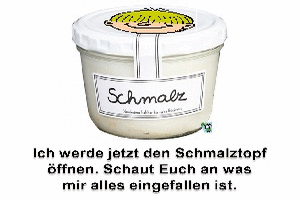 | Hoffnung und Schmalz Gott erhalts Powerpoint (4.43 MB)  20Lustiges Wer mag es nicht - ein leckeres Griebenschmalz-Brot. Da läuft mir gleich das Wasser im Mund zusammen. Und es ist mal wieder genial, was einem nicht so alles zum Thema Schmalz einfallen kann ;-)  | Lustiges | 01.03.21-21:56 | lucky | |