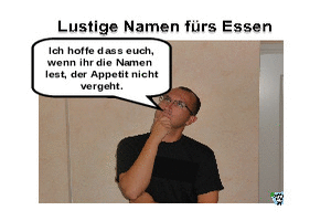 | Lustige Namen für Essen Powerpoint (6.24 MB) 52Lustiges Achtung, hier bekommst du sofort Appetit auf diese leckeren Gerichte mit den lustigen Namen. Der falsche Hase wäre doch mal was für Ostern ;-) | Lustiges | 25.03.-21:19 | lucky | |