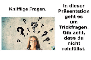 | Knifflige Fragen Nr. 5 Powerpoint (3.3 MB) 30Lustiges → Wissenswertes Ein weiterer Teil dieser coolen Präsentationen, in denen es um Trickfragen und geniale Wortspiele geht. | Lustiges → Wissenswertes | 19.03.-21:44 | lucky | |