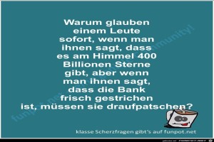 | Scherzfrage Bild (64.51 KB) 2Lustiges → Scherzfragen | Lustiges → Scherzfragen | 26.10.23-10:56 | Fossy | |