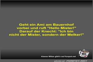 | Geht ein Ami am Bauernhof vorbei und ruft "Hello Mister!" Bild (24.78 KB) 5Lustiges → klasse Sprüche und Witze | Lustiges → klasse Sprüche und Witze | 09.12.24-09:15 | Fossy | |
