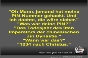 | Oh Mann, jemand hat meine PIN-Nummer gehackt Bild (46.33 KB) 1Lustiges → klasse Sprüche und Witze | Lustiges → klasse Sprüche und Witze | 08.12.24-17:43 | Fossy | |