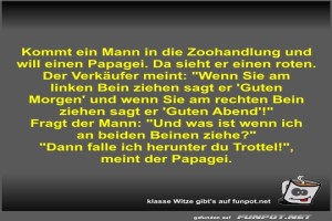 | Kommt ein Mann in die Zoohandlung und will einen Papagei Bild (50.71 KB) 4Lustiges → klasse Sprüche und Witze | Lustiges → klasse Sprüche und Witze | 06.12.24-13:00 | Fossy | |