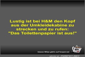 | Lustig ist bei H&M den Kopf aus der Umkleidekabine zu... Bild (28.37 KB) 4Lustiges → klasse Sprüche und Witze | Lustiges → klasse Sprüche und Witze | 27.11.24-13:13 | Fossy | |