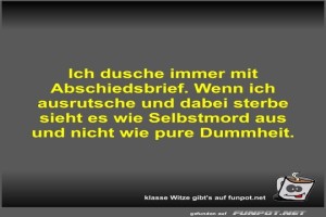| Ich dusche immer mit Abschiedsbrief Bild (31.56 KB) 4Lustiges → klasse Sprüche und Witze | Lustiges → klasse Sprüche und Witze | 27.11.24-10:17 | Fossy | |