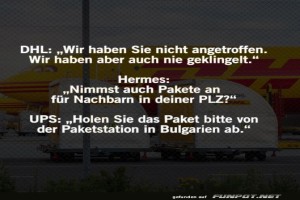 | Die Paketdienste Bild (89.33 KB) 9Lustiges → klasse Sprüche und Witze | Lustiges → klasse Sprüche und Witze | 27.11.24-13:30 | ||