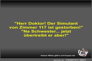 | "Herr Doktor! Der Simulant von Zimmer 117 ist gestorben!" Bild (25.35 KB) 4Lustiges → klasse Sprüche und Witze | Lustiges → klasse Sprüche und Witze | 28.11.24-12:52 | Fossy | |