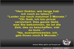 | Herr Doktor, wie lange hab ich noch zu leben? Bild (41.66 KB) 1Lustiges → klasse Sprüche und Witze | Lustiges → klasse Sprüche und Witze | 28.11.24-17:42 | Fossy | |