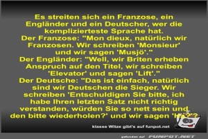 | Es streiten sich ein Franzose Bild (67.71 KB) 1Lustiges → klasse Sprüche und Witze | Lustiges → klasse Sprüche und Witze | 29.11.24-09:20 | Fossy | |