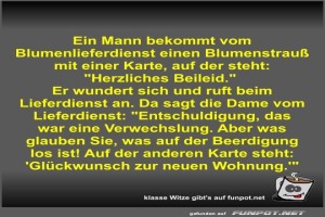 | Ein Mann bekommt vom Blumenlieferdienst einen Blumenstrauß Bild (57.85 KB) 6Lustiges → klasse Sprüche und Witze | Lustiges → klasse Sprüche und Witze | 26.11.24-12:37 | Fossy | |