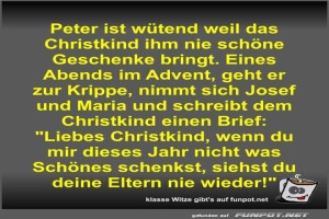 | Peter ist wütend weil das Christkind ihm nie schöne... Bild (59.71 KB) 1Lustiges → klasse Sprüche und Witze | Lustiges → klasse Sprüche und Witze | 26.11.24-17:31 | Fossy | |