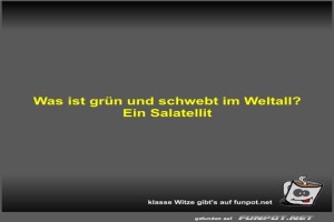 | Was ist grün und schwebt im Weltall? Bild (15.66 KB) 3Lustiges → klasse Sprüche und Witze | Lustiges → klasse Sprüche und Witze | 24.11.24-20:05 | Fossy | |