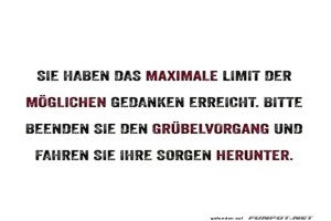 | Grübelvorgang beenden Bild (31.92 KB) 1Lustiges → klasse Sprüche und Witze | Lustiges → klasse Sprüche und Witze | 20.11.24-06:59 | Kelly24 | |