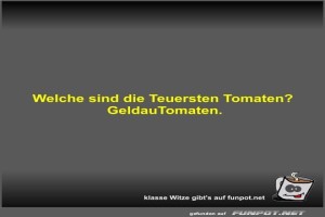 | Welche sind die Teuersten Tomaten? Bild (16.15 KB) Lustiges → klasse Sprüche und Witze | Lustiges → klasse Sprüche und Witze | 18.11.24-14:04 | Fossy | ||