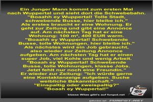 | Ein Junger Mann kommt zum ersten Mal nach Wuppertal und... Bild (88.45 KB) 1Lustiges → klasse Sprüche und Witze | Lustiges → klasse Sprüche und Witze | 18.11.24-10:54 | Fossy | |