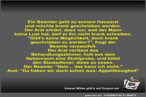 | Ein Beamter geht zu seinem Hausarzt und möchte krank... Bild (49.64 KB) 1Lustiges → klasse Sprüche und Witze | Lustiges → klasse Sprüche und Witze | 16.11.24-14:16 | Fossy | |