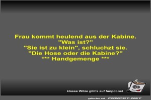 | Frau kommt heulend aus der Kabine Bild (26.25 KB) 3Lustiges → klasse Sprüche und Witze | Lustiges → klasse Sprüche und Witze | 17.11.24-10:56 | Fossy | |