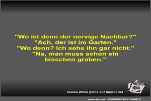 | Wo ist denn der nervige Nachbar? Bild (27.79 KB) 4Lustiges → klasse Sprüche und Witze | Lustiges → klasse Sprüche und Witze | 11.11.24-10:58 | Fossy | |