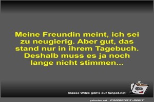 | Meine Freundin meint, ich sei zu neugierig Bild (32.27 KB) 3Lustiges → klasse Sprüche und Witze | Lustiges → klasse Sprüche und Witze | 10.11.24-10:54 | Fossy | |