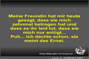 | Meine Freundin hat mir heute gesagt Bild (38.12 KB) 1Lustiges → klasse Sprüche und Witze | Lustiges → klasse Sprüche und Witze | 01.11.24-10:13 | Fossy | |