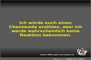 | Ich würde euch einen Chemiewitz erzählen Bild (26.96 KB) 2Lustiges → klasse Sprüche und Witze | Lustiges → klasse Sprüche und Witze | 31.10.24-17:06 | Fossy | |