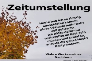 | Zeitumstellung Bild (123.64 KB) 2Lustiges → klasse Sprüche und Witze | Lustiges → klasse Sprüche und Witze | 28.10.24-09:50 | Kelly24 | |